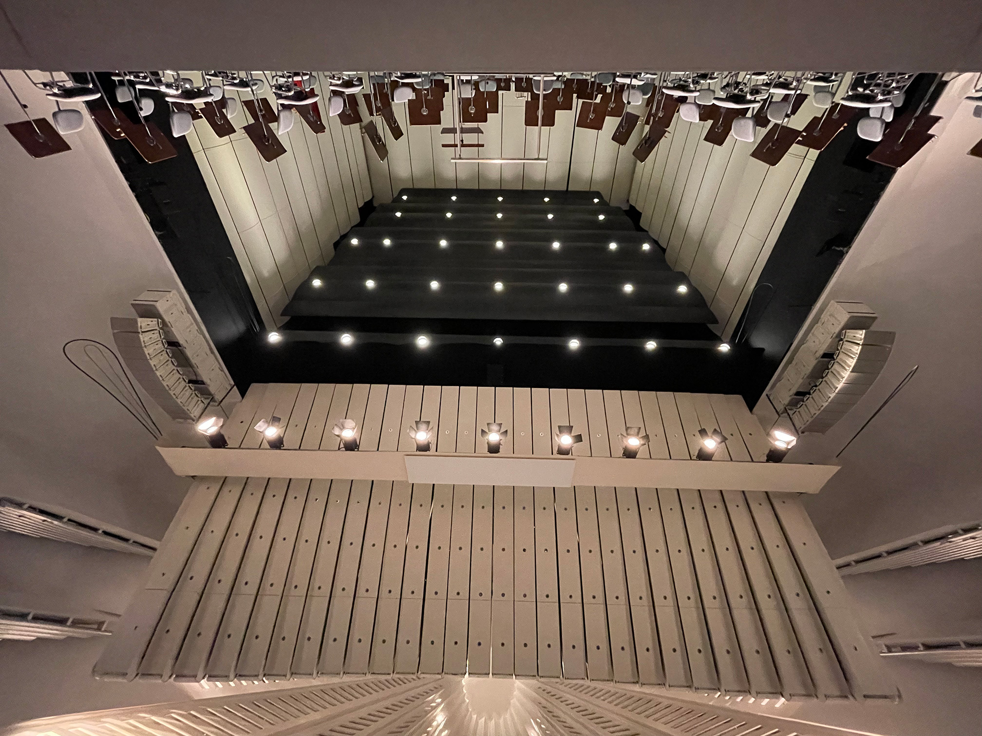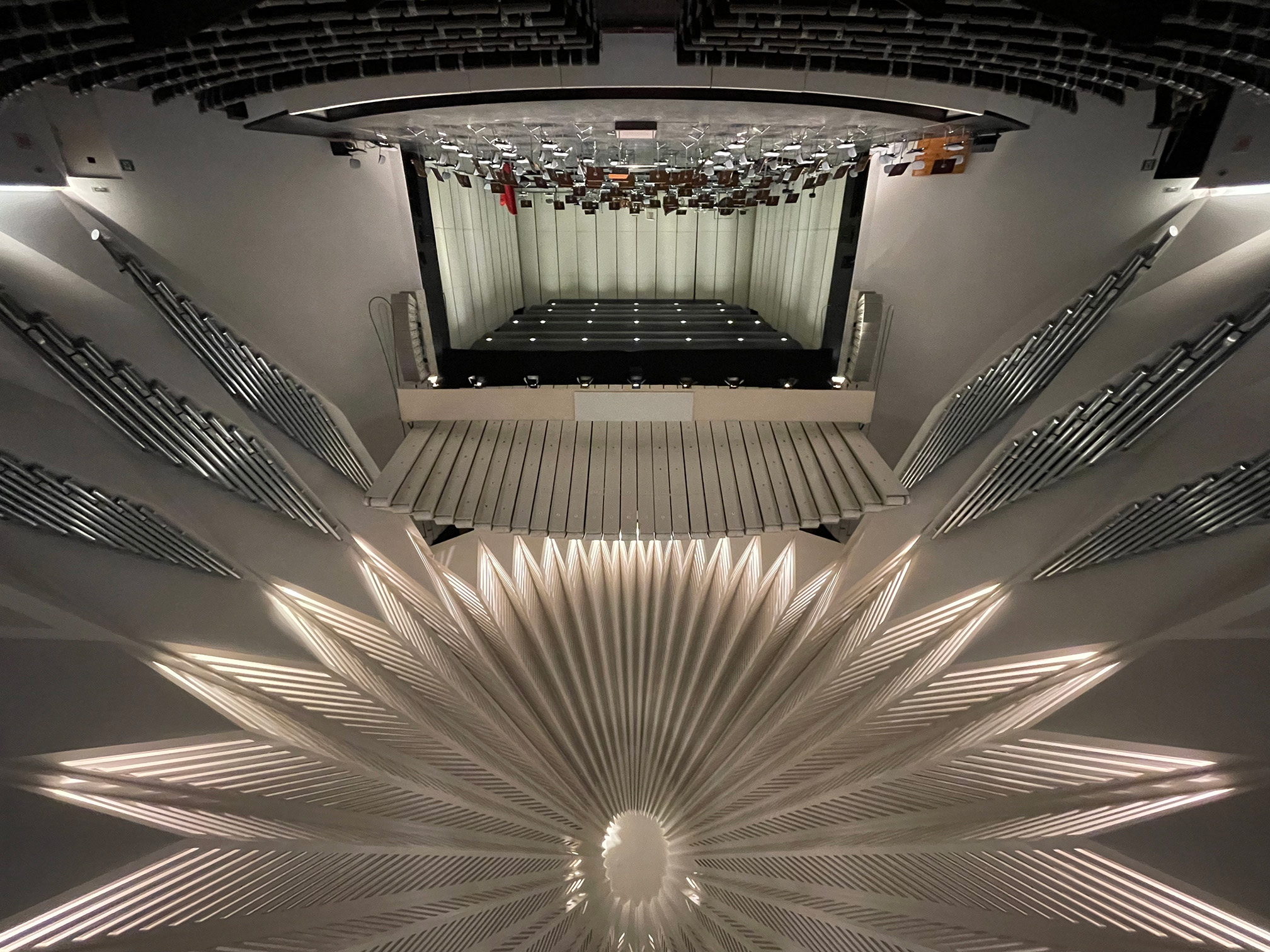 Comprehensive design of performance spaces: auditorium, stage, backstage, and circulation flows.